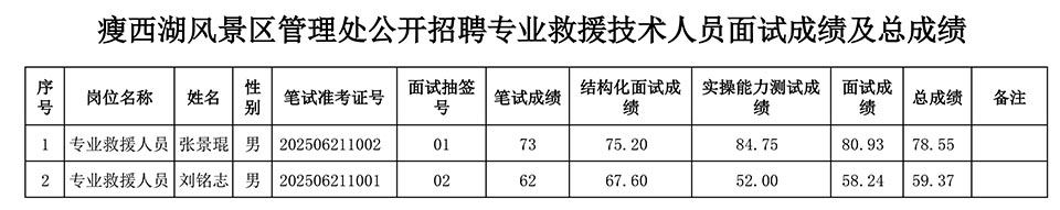 根据《瘦西湖风景区管理处公开招聘专业救援技术人员公告》相关安排,于2025年7月4日组织实施了专业救援技术人员招聘考试面试及实操能力测试,现将报考人员面试成绩及总成绩予以公示。